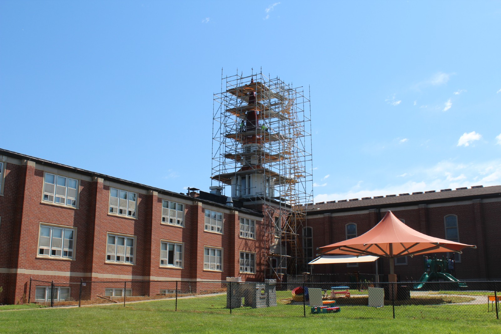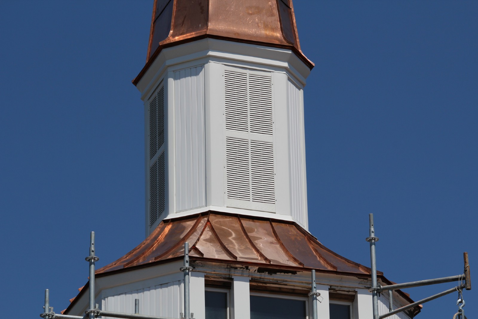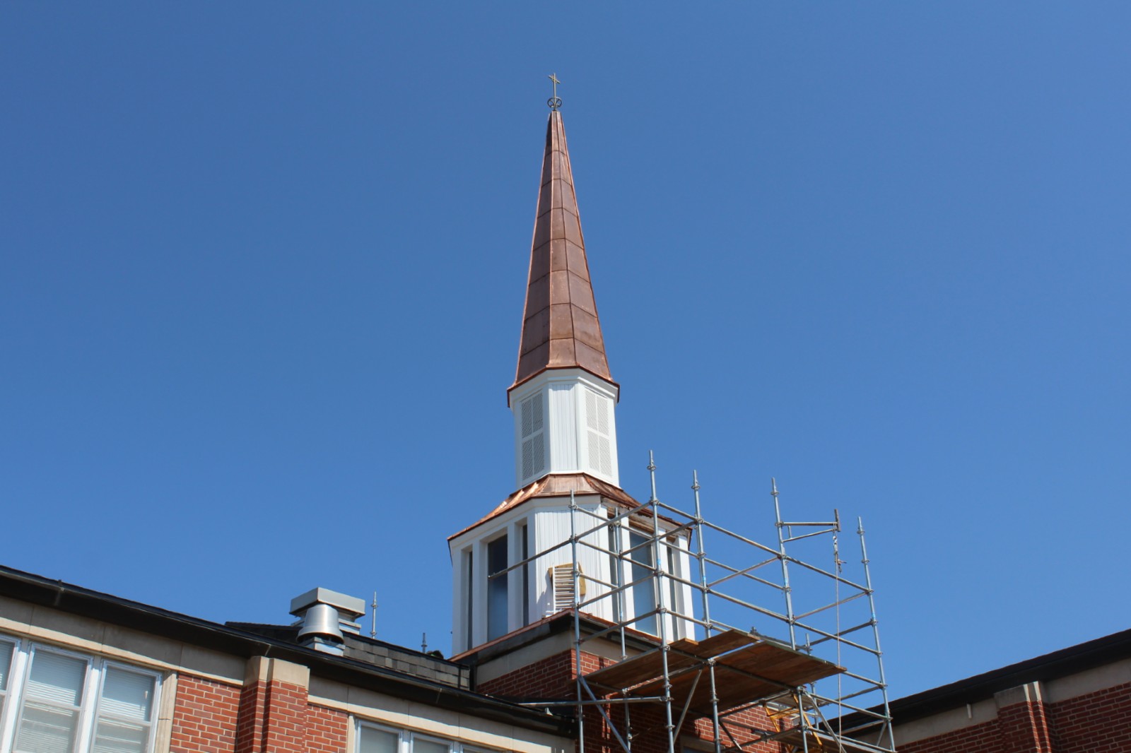 This was a very delicate job. We had to use scaffolding all around the steeple to reach the top of the steeple safely. Each piece of copper was custom fit and bent to the project.