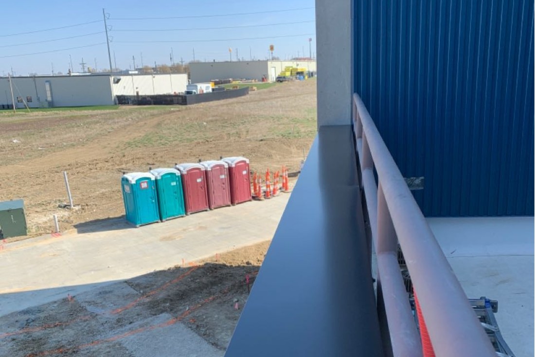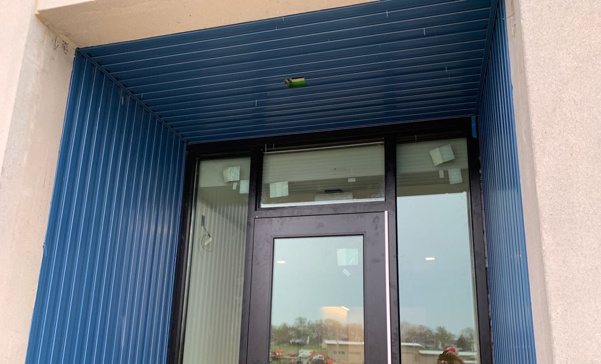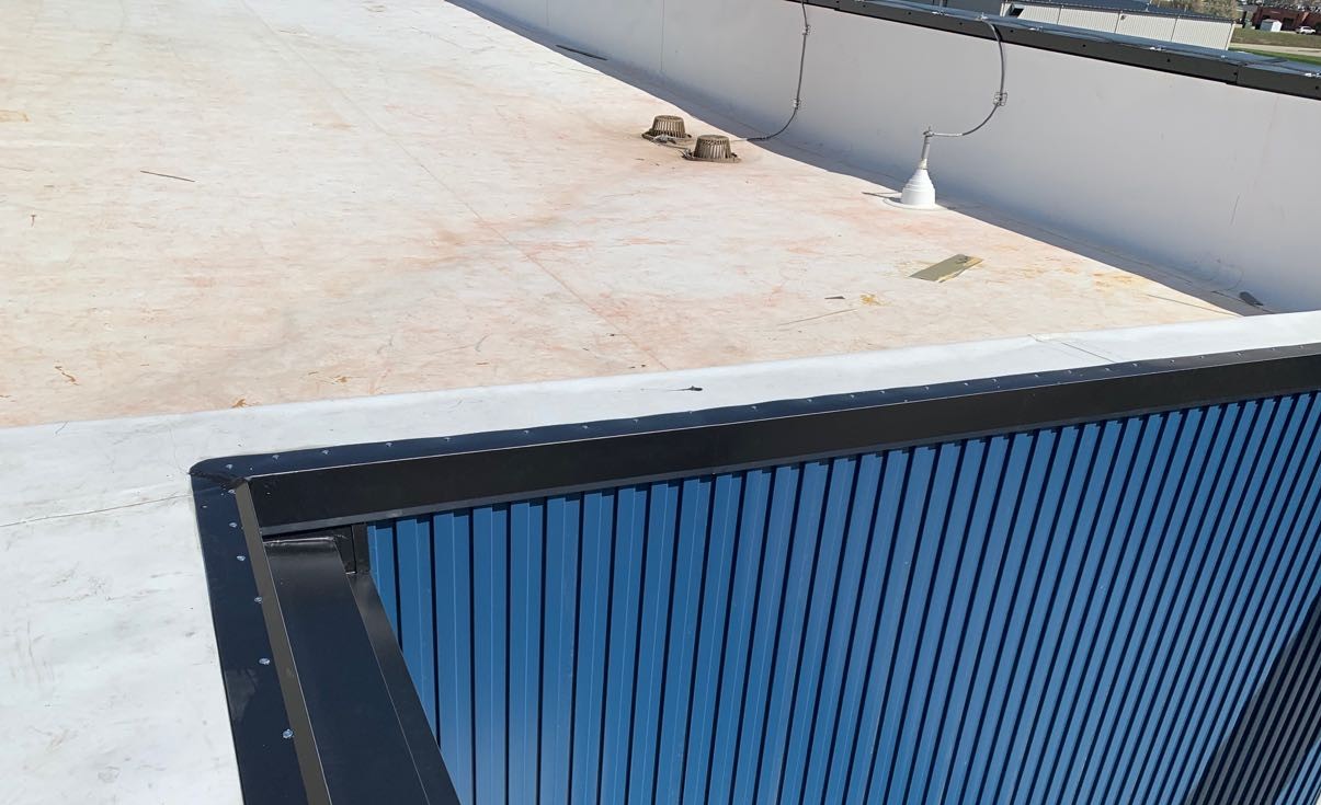 Products Used: Elevate 80 mil TPO membrane, Atas Metal Wall Panels in Regal Blue, Bison Patio Pavers